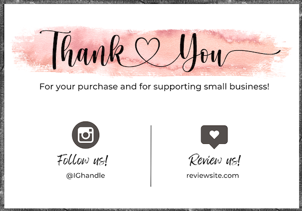Remember, you can always put the thank-you message on the front of the card and add more information or requests on the back. This could include your website URL, social media links, and links to review platforms.