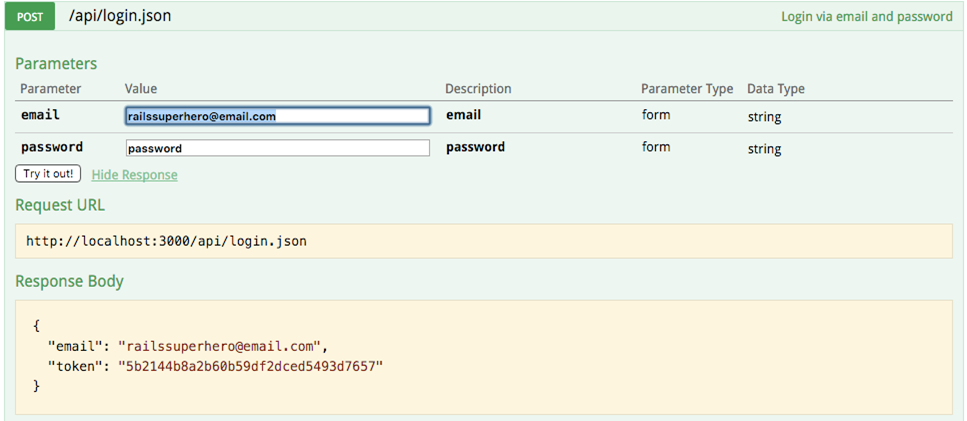 Upon successful login, we’ll return the first valid authentication_token along with the user’s email in the following format: