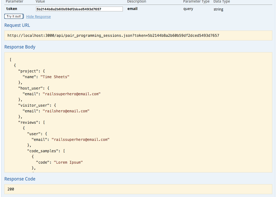 To call the pair_programming_sessions API endpoint, we need to log in. Using one of the email and password combinations from our seed file, submit a login request to the login API endpoint via Swagger, as demonstrated below.